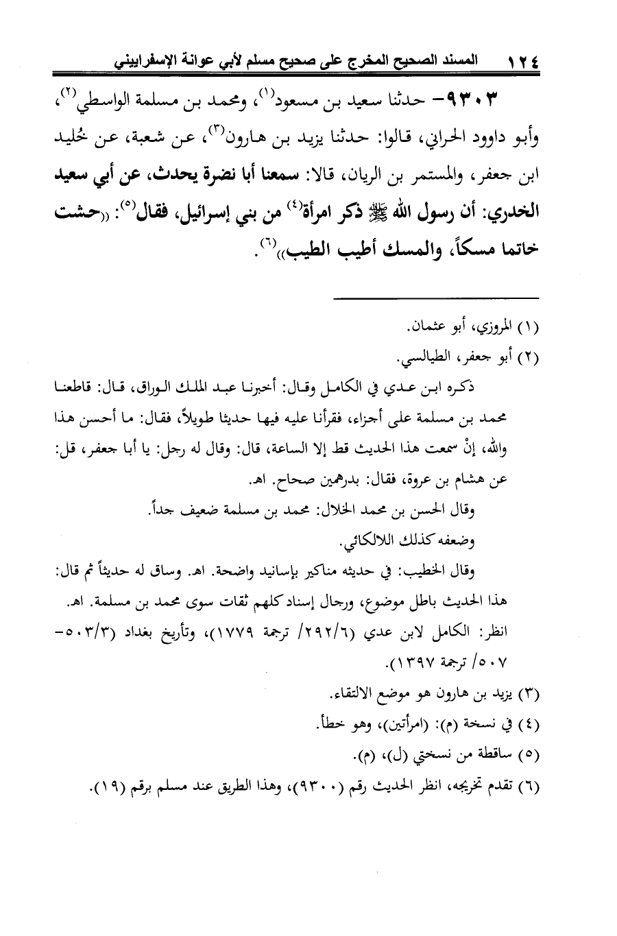 9303 - حدثنا سعيد بن مسعود (¬1)، ومحمد بن مسلمة الواسطي (¬2)، وأبو داوود الحراني، قالوا: حدثنا يزيد بن هارون (¬3)، عن شعبة، عن خُليد ابن جعفر، والمستمر بن الريان، قالا: سمعنا أبا نضرة يحدث، عن أبي سعيد الخدري: أن رسول الله -صلى الله عليه وسلم- ذكر امرأة (¬4) من بني إسرائيل، فقال (¬5): "حشت خاتما مسكًا، والمسك أطيب الطيب" (¬6).