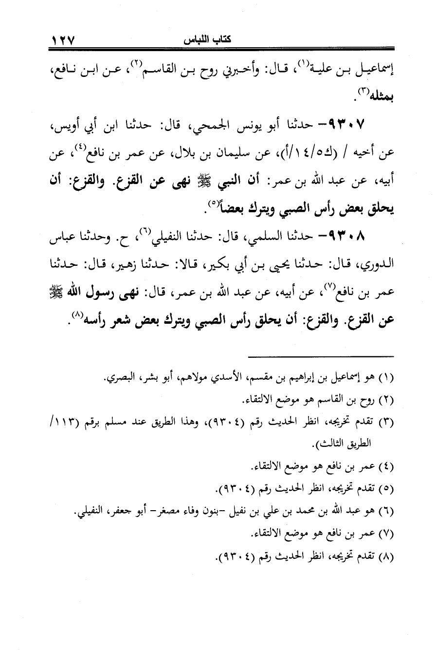 9308 - حدثنا السلمي، قال: حدثنا النفيلي (¬1)، ح. وحدثنا عباس الدوري، قال: حدثنا يحيى بن أبي بكير، قالا: حدثنا زهير، قال: حدثنا عمر بن نافع (¬2)، عن أبيه، عن عبد الله بن عمر، قال: نهى رسول الله -صلى الله عليه وسلم- عن القزع. والقزع: أن يحلق رأس الصبي ويترك بعض شعر رأسه (¬3).