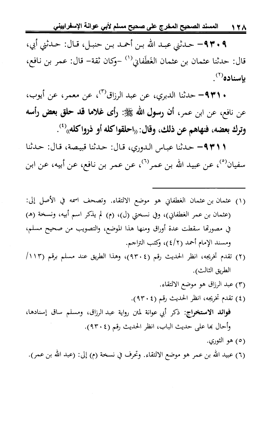 (¬1) عثمان بن عثمان الغطفاني هو موضع الالتقاء. وتصحف اسمه في الأصل إلى: (عثمان بن عمر الغطفاني)، وفي نسختي (ل)، (م) لم يذكر اسم أبيه، ونسخة (هـ) في مصورتها سقطت عدة أوراق ومنها هذا الموضع، والتصويب من صحيح مسلم، ومسند الإِمام أحمد (2/ 4)، كتب التراجم.