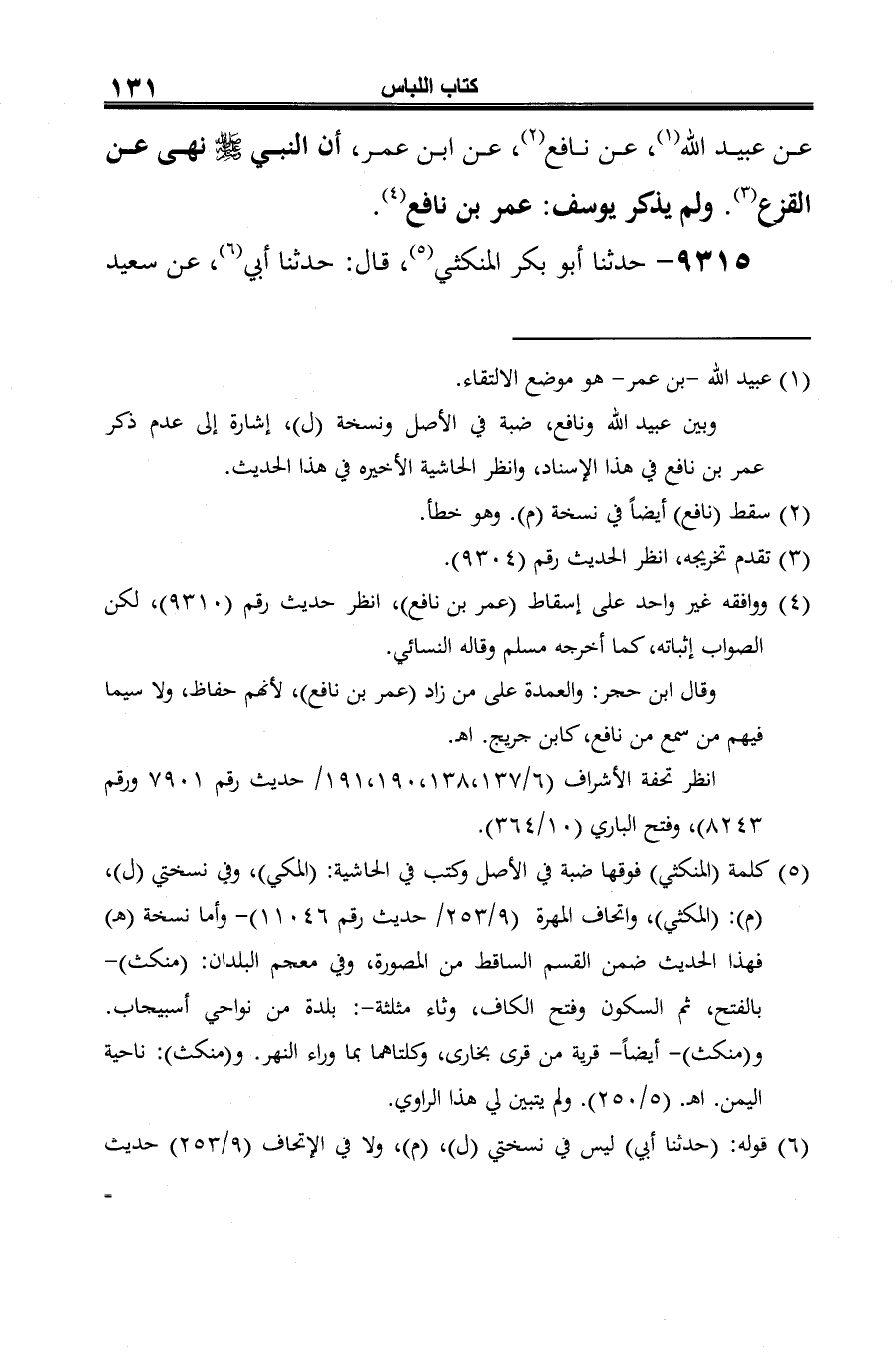 -[132]- ابن سليمان -يعني السَّمَطي (¬3) ثقة- عن موسى بن طارق (¬4) -يعني أبا قُرَّة- قال (¬5): قال ابن جريج: أخبرني عبيد الله بن عمر بن حفص (¬6)، أن عمر بن نافع أخبره، أن نافع -مولى ابن عمر- أخبره أنه سمع ابن عمر يقول: سمعت النبي -صلى الله عليه وسلم- ينهى عن القزع (¬7).