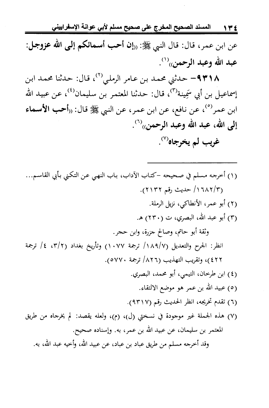 9318 - حدثني محمَّد بن عامر الرملي (¬1)، قال: حدثنا محمَّد ابن إسماعيل بن أبي سَمِينة (¬2)، قال: حدثنا المعتمر بن سليمان (¬3)، عن عبيد الله ابن عمر (¬4)، عن نافع، عن ابن عمر، عن النبي -صلى الله عليه وسلم- قال: "أحب الأسماء إلى الله، عبد الله وعبد الرحمن" (¬5).