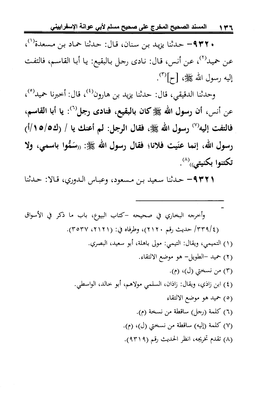 9320 - حدثنا يزيد بن سنان، قال: حدثنا حماد بن مسعدة (¬1)، عن حميد (¬2)، عن أنس، قال: نادى رجل بالبقيع: يا أبا القاسم، فالتفت إليه رسول الله -صلى الله عليه وسلم-، [ح] (¬3).