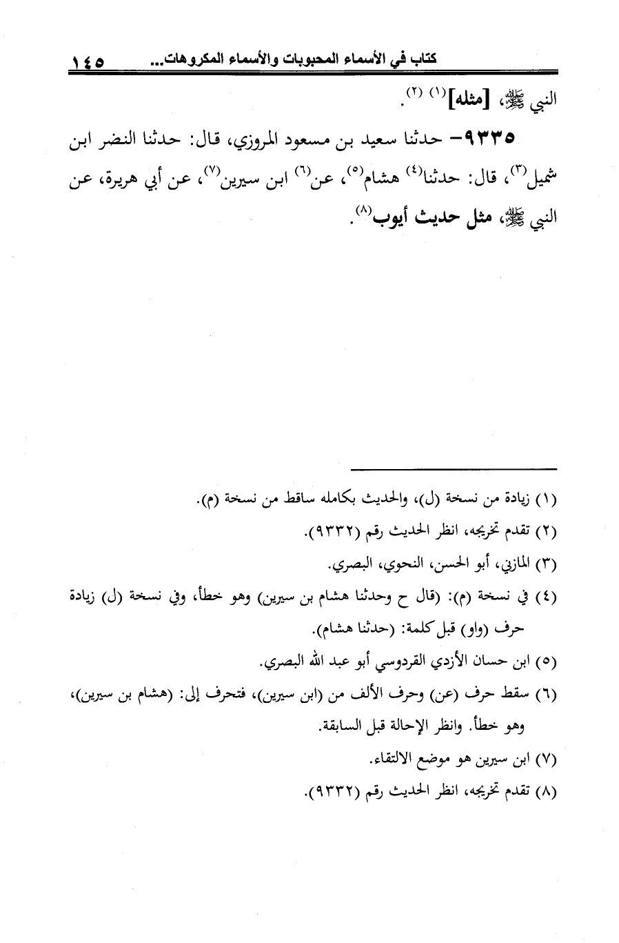 9335 - حدثنا سعيد بن مسعود المروزي، قال: حدثنا النضر ابن شميل (¬1)، قال: حدثنا (¬2) هشام (¬3)، عن (¬4) ابن سيرين (¬5)، عن أبي هريرة، عن النبي -صلى الله عليه وسلم-، مثل حديث أيوب (¬6).