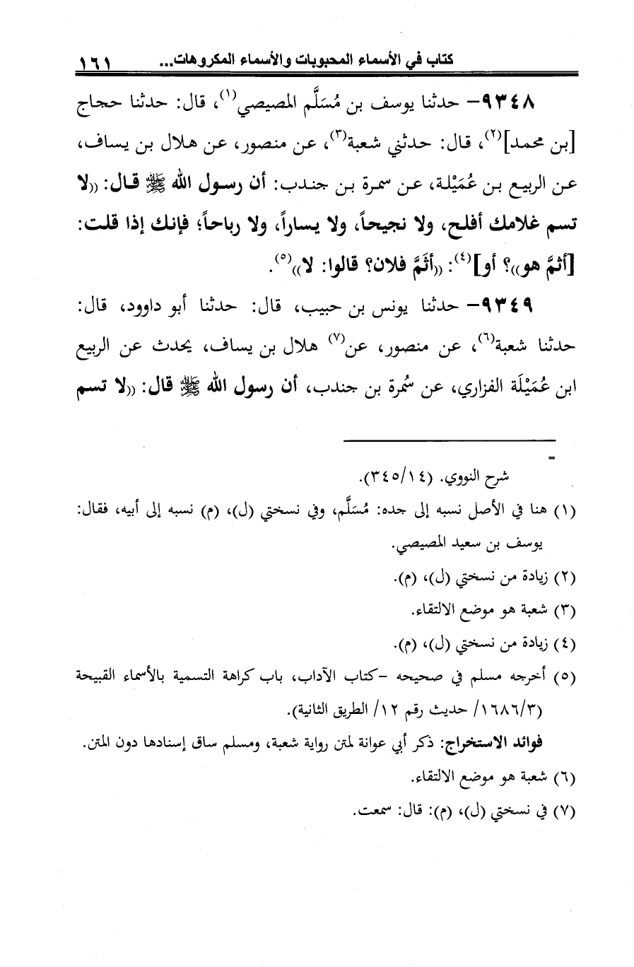 9348 - حدثنا يوسف بن مُسَلَّم المصيصي (¬1)، قال: حدثنا حجاج [بن محمد] (¬2)، قال: حدثني شعبة (¬3)، عن منصور، عن هلال بن يساف، عن الربيع بن عُمَيْلة، عن سمرة بن جندب: أن رسول الله -صلى الله عليه وسلم- قال: "لا تسم غلامك أفلح، ولا نجيحًا، ولا يسارًا، ولا رباحًا؛ فإنك إذا قلت: [أثمَّ هو"؟ أو] (¬4): "أثَمَّ فلان؟ قالوا: لا" (¬5).