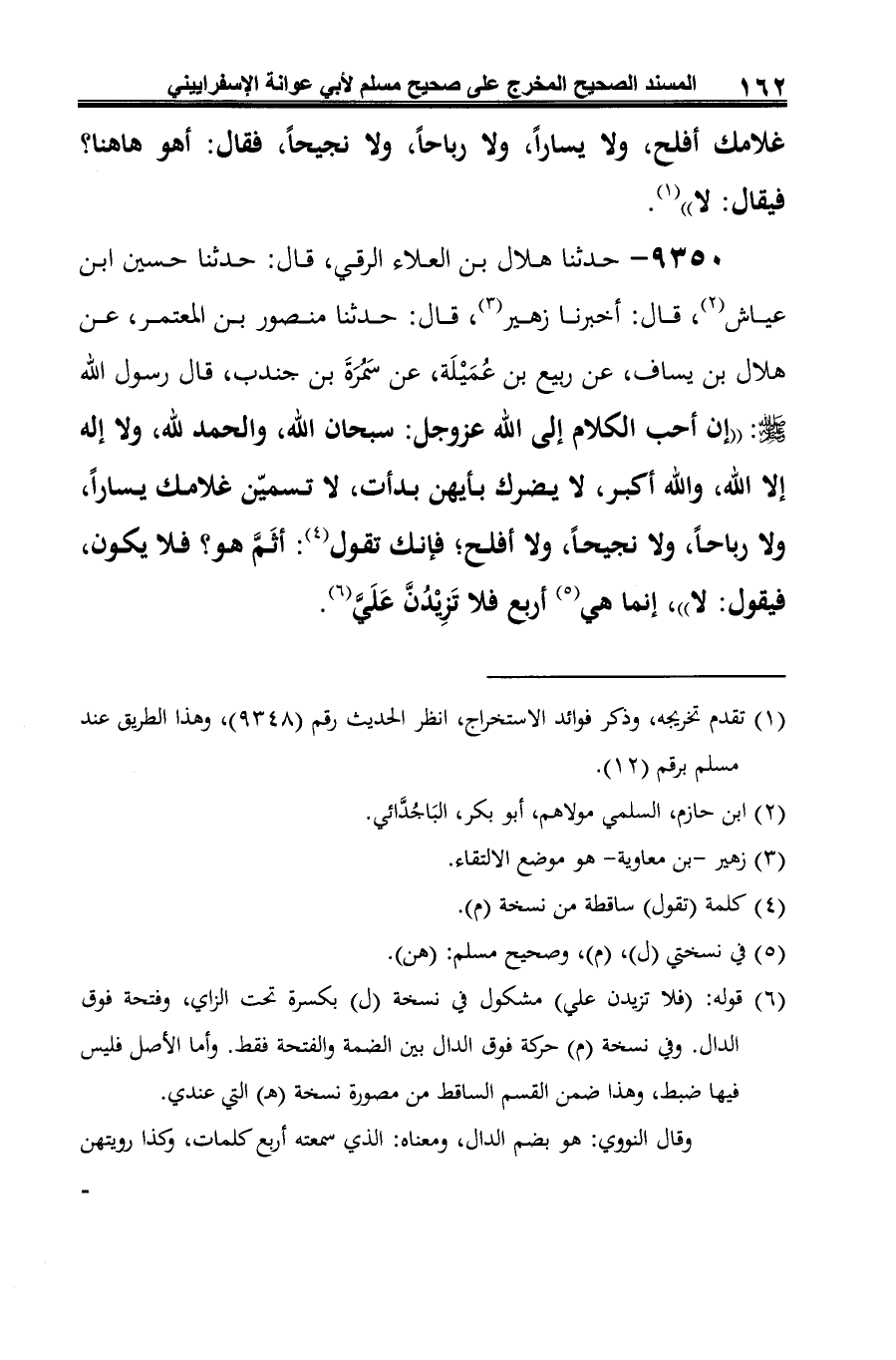 9350 - حدثنا هلال بن العلاء الرقي، قال: حدثنا حسين ابن عياش (¬1)، قال: أخبرنا زهير (¬2)، قال: حدثنا منصور بن المعتمر، عن هلال بن يساف، عن ربيع بن عُمَيْلَة، عن سَمُرَةَ بن جندب، قال رسول الله -صلى الله عليه وسلم-: "إن أحب الكلام إلى الله عَزَّ وَجَلَّ: سبحان الله، والحمد لله، ولا إله إلا الله، والله أكبر، لا يضرك بأيهن بدأت، لا تسمين غلامك يسارًا، ولا رباحًا، ولا نجيحًا، ولا أفلح؛ فإنك تقول (¬3): "أثَمَّ هو؟ فلا يكون، فيقول: لا"، إنما هي (¬4) أربع فلا تَزِيْدنَّ عَلَيَّ (¬5).