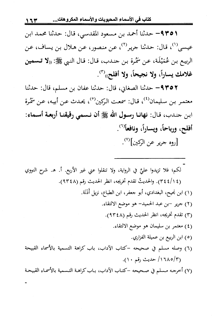 9351 - حدثنا أحمد بن مسعود المقدسي، قال: حدثنا محمَّد ابن عيسى (¬1)، قال: حدثنا جرير (¬2)، عن منصور، عن هلال بن يساف، عن الربيع بن عُمَيْلَة، عن سَمُرة بن جندب، قال: قال النبي -صلى الله عليه وسلم-: "لا تسمين غلامك يسارًا، ولا نجيحًا، ولا أفلح" (¬3).