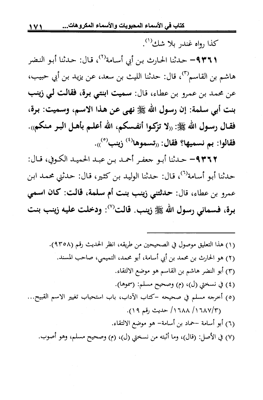 9362 - حدثنا أبو جعفر أحمد بن عبد الحميد الكوفي، قال: حدثنا أبو أسامة (¬1)، قال: حدثنا الوليد بن كثير، قال: حدثني محمَّد ابن عمرو بن عطاء، قال: حدثتني زينب بنت أم سلمة، قالت: كان اسمي برة، فسماني رسول الله -صلى الله عليه وسلم- زينب. قالت (¬2): ودخلت عليه زينب بنت
