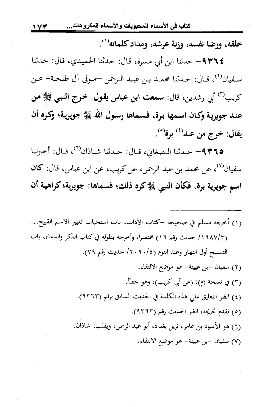 9365 - حدثنا الصغاني، قال: حدثنا شاذان (¬1)، قال: أخبرنا سفيان (¬2)، عن محمَّد بن عبد الرحمن، عن كريب، عن ابن عباس، قال: كان اسم جويرية برة، فكان النبي -صلى الله عليه وسلم- كره ذلك؛ فسماها: جويرية، كراهية أن