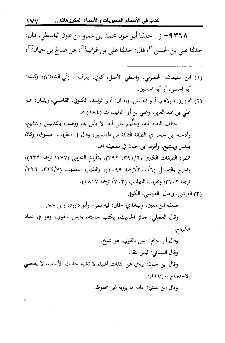 9368 - ز- حدثنا أبو عون محمَّد بن عمرو بن عون الواسطي، قال: حدثنا علي بن الحسن (¬1)، قال: حدثنا علي بن غراب (¬2)، عن صالح بن حيان (¬3)،