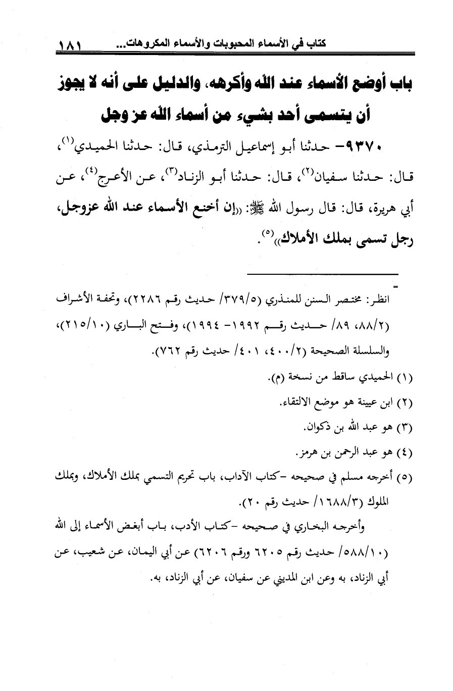 9370 - حدثنا أبو إسماعيل الترمذي، قال: حدثنا الحميدي (¬1)، قال: حدثنا سفيان (¬2)، قال: حدثنا أبو الزناد (¬3)، عن الأعرج (¬4)، عن أبي هريرة، قال: قال رسول الله -صلى الله عليه وسلم-: "إن أخنع الأسماء عند الله عَزَّ وَجَلَّ، رجل تسمى بملك الأملاك" (¬5).