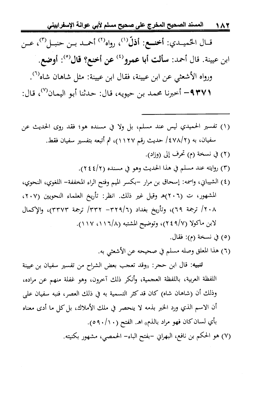 (¬3) في الأصل ضبة على هذه الكلمة، وهي روية البخاري، وفي الحاشية: (أخنع) وعليها ضبة أيضًا، وهي رواية مسلم، فكأن الناسخ تردد فيها, لكن ذكر ابن حجر: أن أكثر الرواة عن شعيب بن أبي حمزة على لفظ: (أخنى) الفتح (10/ 589).
