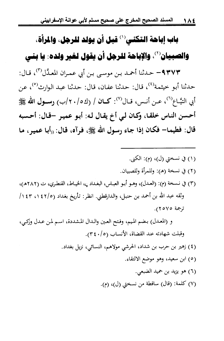 9373 - حدثنا أحمد بن موسى بن أبي عمران المعدَّل (¬1)، قال: حدثنا أبو خيثمة (¬2)، قال: حدثنا عفان، قال: حدثنا عبد الوارث (¬3)، عن أبي التيَّاع (¬4)، عن أنس، قال (¬5): كان رسول الله -صلى الله عليه وسلم- أحسن الناس خلقا، وكان لي أخ يقال له: أبو عمير -قال: أحسبه قال: فطيما- فكان إذا جاء رسول الله -صلى الله عليه وسلم-، فرآه، قال: "أبا عمير، ما
