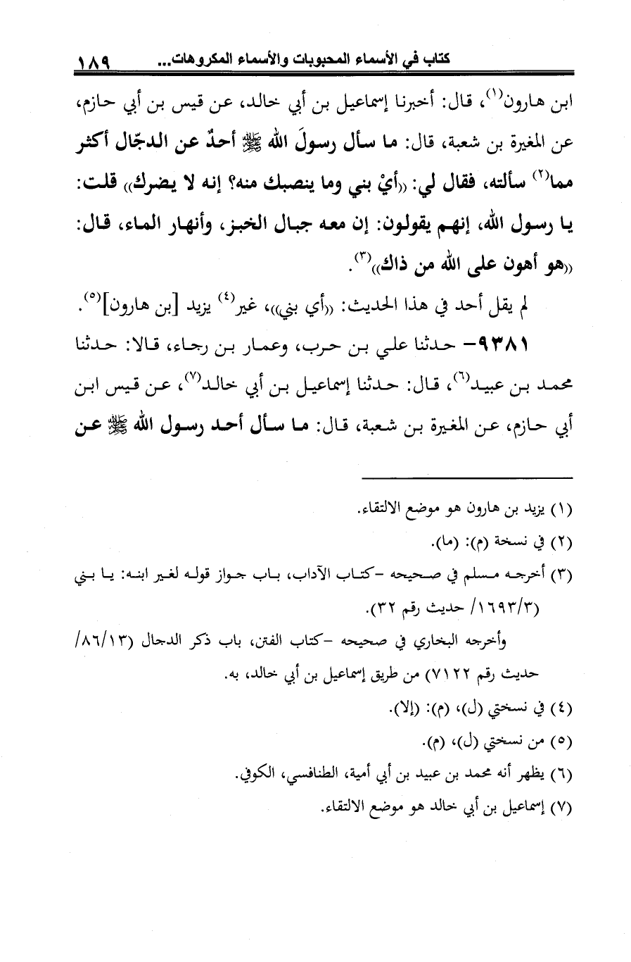 9381 - حدثنا علي بن حرب، وعمار بن رجاء، قالا: حدثنا محمَّد بن عبيد (¬1)، قال: حدثنا إسماعيل بن أبي خالد (¬2)، عن قيس ابن أبي حازم، عن المغيرة بن شعبة، قال: ما سأل أحد رسول الله -صلى الله عليه وسلم- عن
