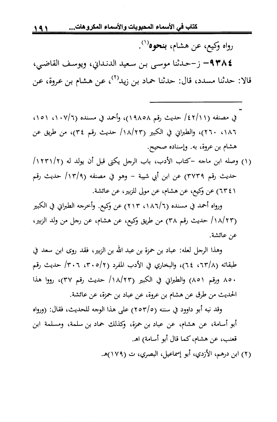 9384 - ز- حدثنا موسى بن سعيد الدنداني، ويوسف القاضي، قالا: حدثنا مسدد، قال: حدثنا حماد بن زيد (¬1)، عن هشام بن عروة، عن