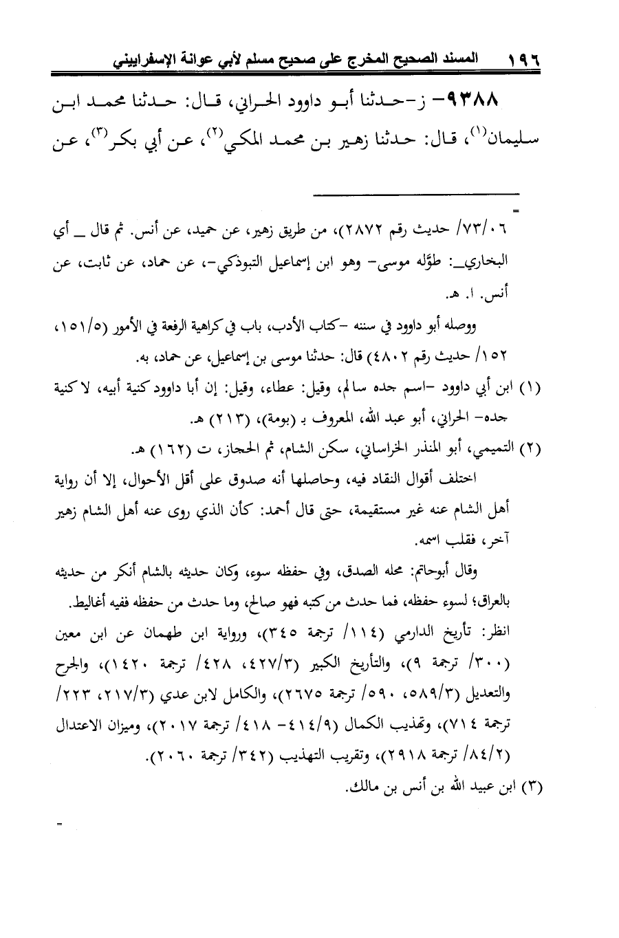 9388 - ز- حدثنا أبو داوود الحراني، قال: حدثنا محمَّد ابن سليمان (¬1)، قال: حدثنا زهير بن محمَّد المكي (¬2)، عن أبي بكر (¬3)، عن