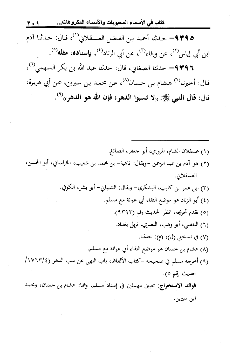 9396 - حدثنا الصغاني، قال: حدثنا عبد الله بن بكر السهمي (¬1)، قال: أخبرنا (¬2) هشام بن حسان (¬3)، عن محمَّد بن سيرين، عن أبي هريرة، قال: قال النبي -صلى الله عليه وسلم-: "لا تسبوا الدهر؛ فإن الله هو الدهر" (¬4).