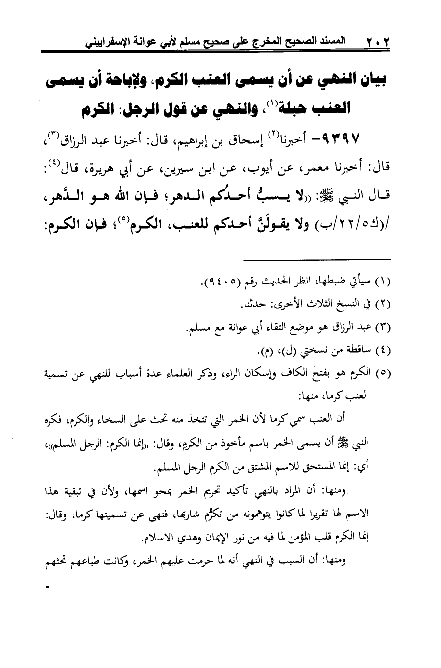 9397 - أخبرنا (¬1) إسحاق بن إبراهيم، قال: أخبرنا عبد الرزاق (¬2)، قال: أخبرنا معمر، عن أيوب، عن ابن سيرين، عن أبي هريرة، قال (¬3): قال النبي -صلى الله عليه وسلم-: "لا يسبُّ أحدكم الدهر، فإن الله هو الدَّهر، ولا يقولَنَّ أحدكم للعنب، الكرم (¬4)، فإن الكرم: