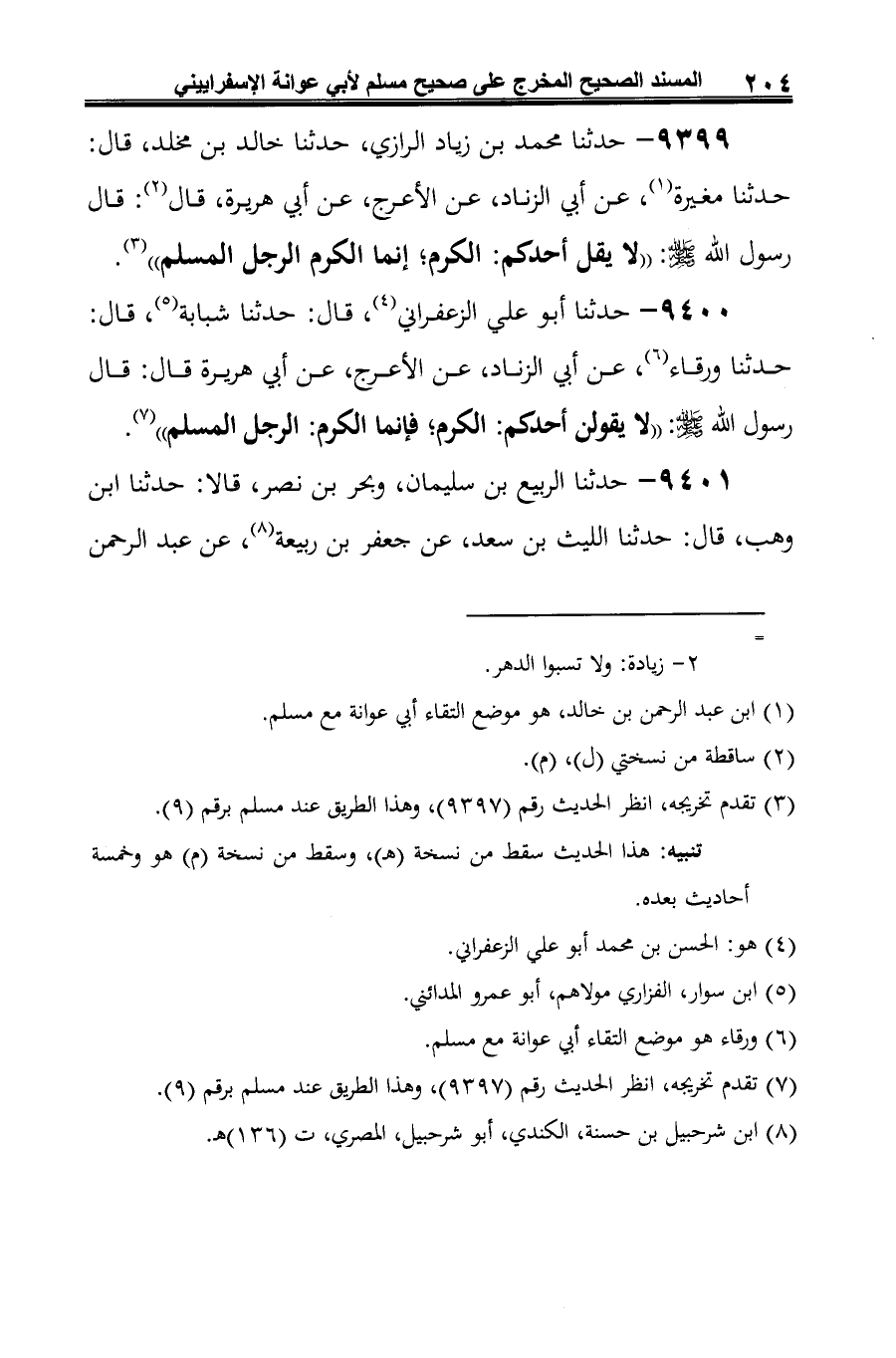 9400 - حدثنا أبو علي الزعفراني (¬1)، قال: حدثنا شبابة (¬2)، قال: حدثنا ورقاء (¬3)، عن أبي الزناد، عن الأعرج، عن أبي هريرة قال: قال رسول الله -صلى الله عليه وسلم-: "لا يقولن أحدكم: الكرم، فإنما الكرم: الرجل المسلم" (¬4).