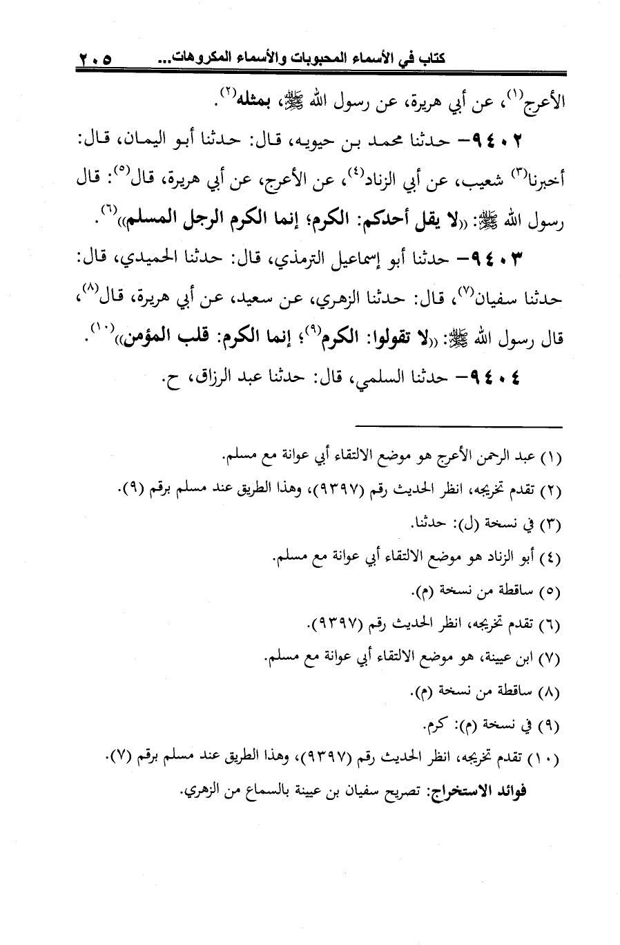 -[206]- وحدثنا الدبري، عن عبد الرزاق (¬1)، عن معمر، عن همام بن منبه، قال: هذا ما حدثنا أبو هريرة، عن رسول الله -صلى الله عليه وسلم-، فذكر أحاديث، منها: وقال رسول الله -صلى الله عليه وسلم-: "لا يقولن أحدكم للعنب الكرم؛ إنما الكرم: الرجل المسلم" (¬2).