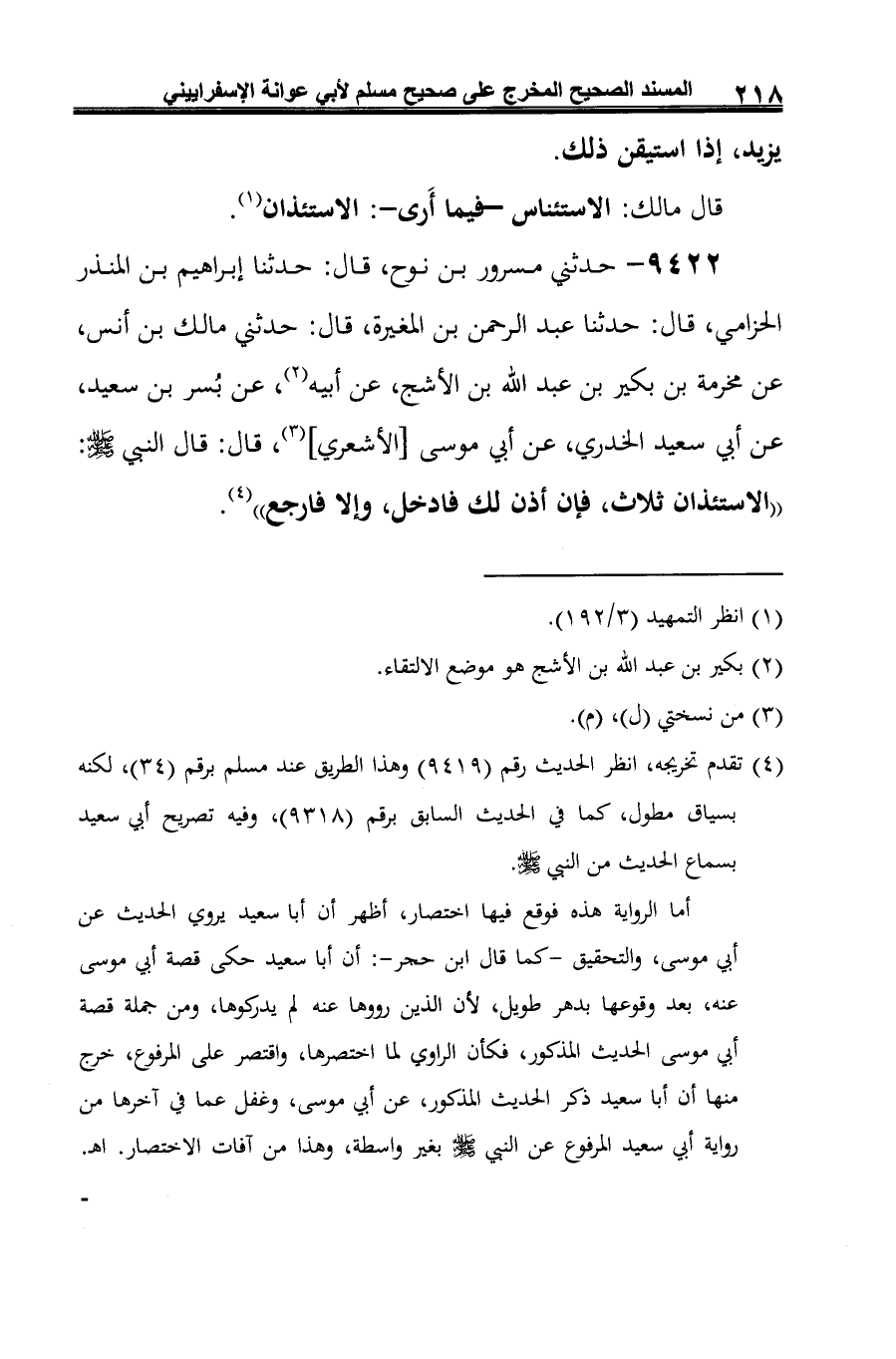 9422 - حدثني مسرور بن نوح، قال: حدّثنا إبراهيم بن المنذر الحزامى، قال: حدّثنا عبد الرّحمن بن المغيرة، قال: حدثني مالك بن أنس، عن مخرمة بن بكير بن عبد الله بن الأشج، عن أبيه (¬1)، عن بُسر بن سعيد، عن أبي سعيد الخدري، عن أبي موسى [الأشعري] (¬2)، قال: قال النبي -صلى الله عليه وسلم-: "الاستئذان ثلاث، فإن أذن لك فادخل، وإلا فارجع" (¬3).