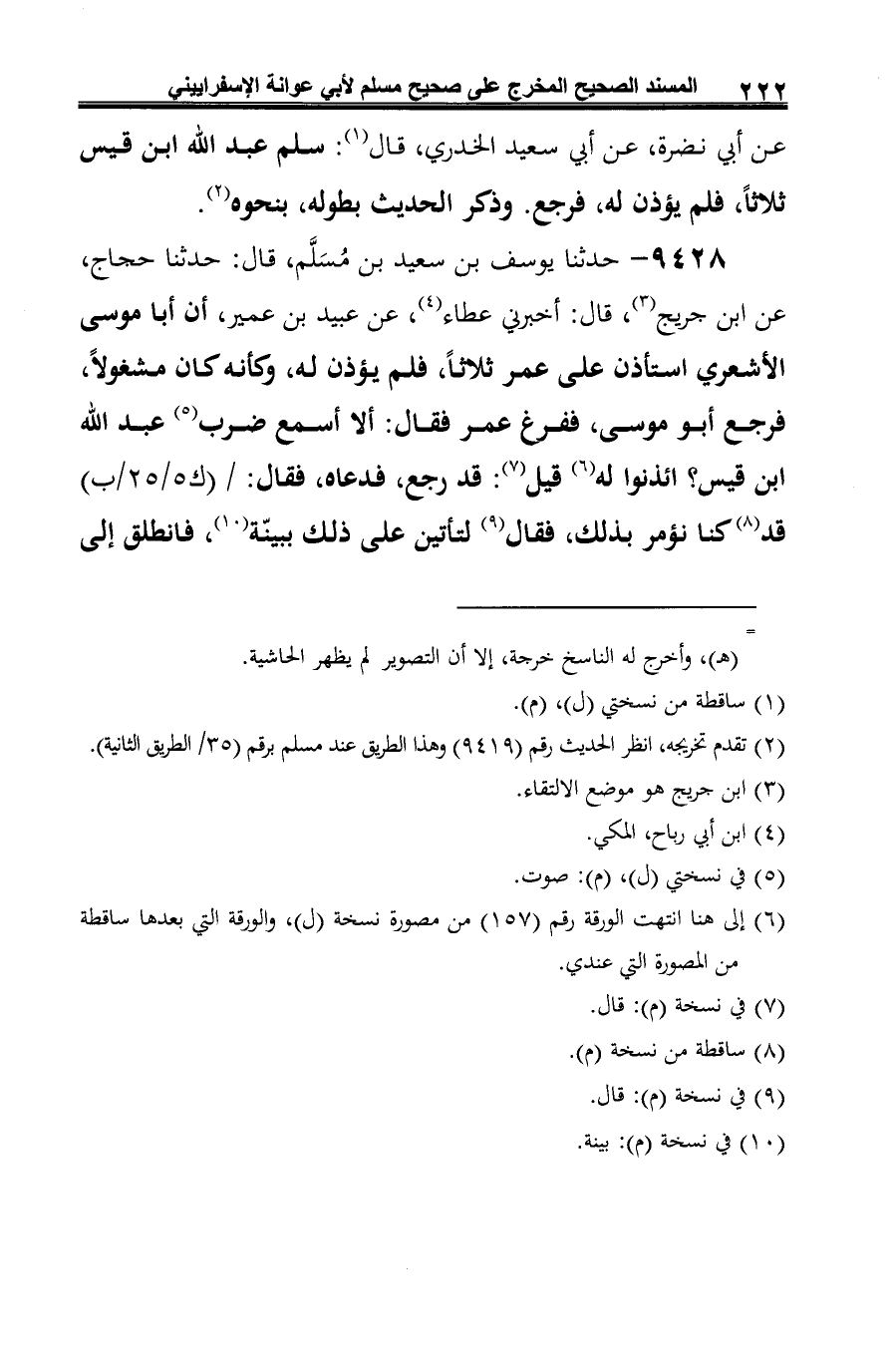 9428 - حدّثنا يوسف بن سعيد بن مُسَلَّم، قال: حدّثنا حجاج، عن ابن جريج (¬1)، قال: أخبرني عطاء (¬2)، عن عبيد بن عمير، أن أبا موسى الأشعري استأذن على عمر ثلاثًا، فلم يؤذن له، وكأنه كان مشغولًا، فرجع أبو موسى، ففرغ عمر فقال: ألَّا أسمع ضرب (¬3) عبد الله ابن قيس؟ ائذنوا له (¬4) قيل (¬5): قد رجع، فدعاه، فقال: قد (¬6) كنا نؤمر بذلك، فقال (¬7) لتأتين على ذلك ببينّة (¬8)، فانطلق إلى