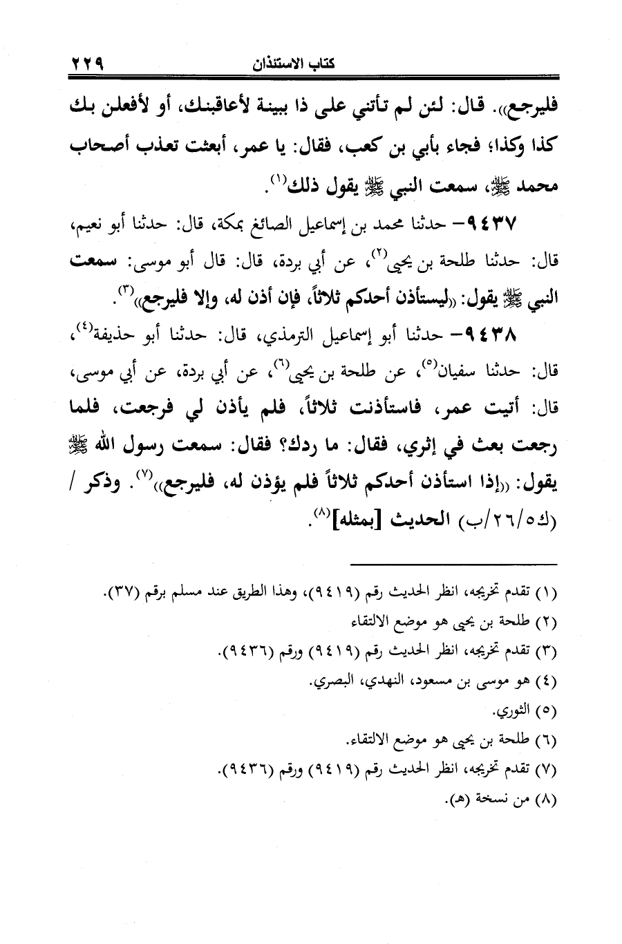 9437 - حدّثنا محمّد بن إسماعيل الصائغ بمكة، قال: حدّثنا أبو نعيم، قال: حدّثنا طلحة بن يحيى (¬1)، عن أبي بردة، قال: قال أبو موسى: سمعت النّبيّ -صلى الله عليه وسلم- يقول: "ليستأذن أحدكم ثلاثًا، فإن أذن له، وإلا فليرجع" (¬2).