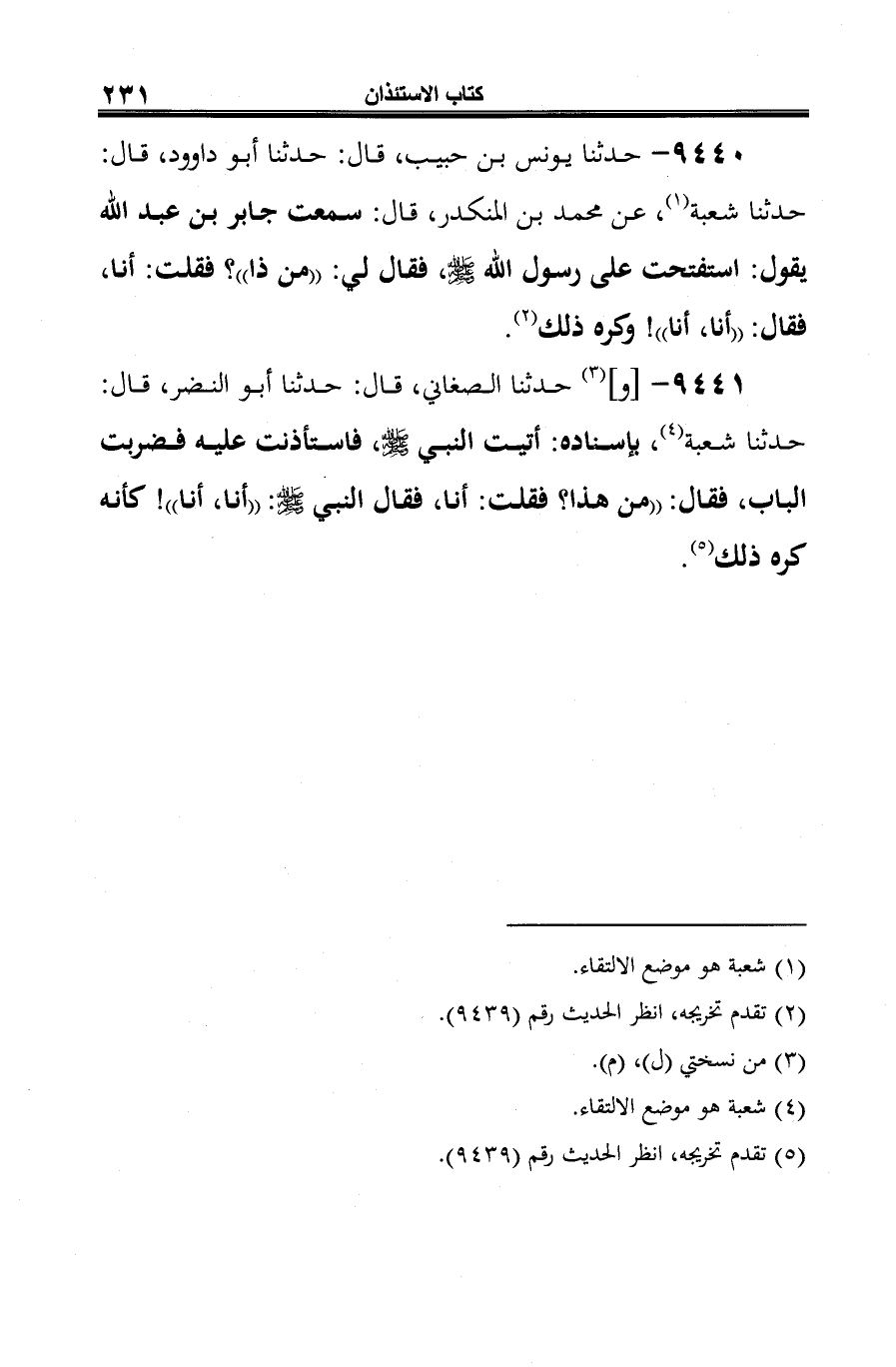 9441 - [و] (¬1) حدّثنا الصغاني، قال: حدّثنا أبو النضر، قال: حدّثنا شعبة (¬2)، بإسناده: أتيت النّبيّ -صلى الله عليه وسلم-، فاستأذنت عليه فضربت الباب، فقال: "من هذا؟ فقلت: أنا، فقال النَّبي -صلى الله عليه وسلم-: "أنا، أنا"! كأنه كره ذلك (¬3).