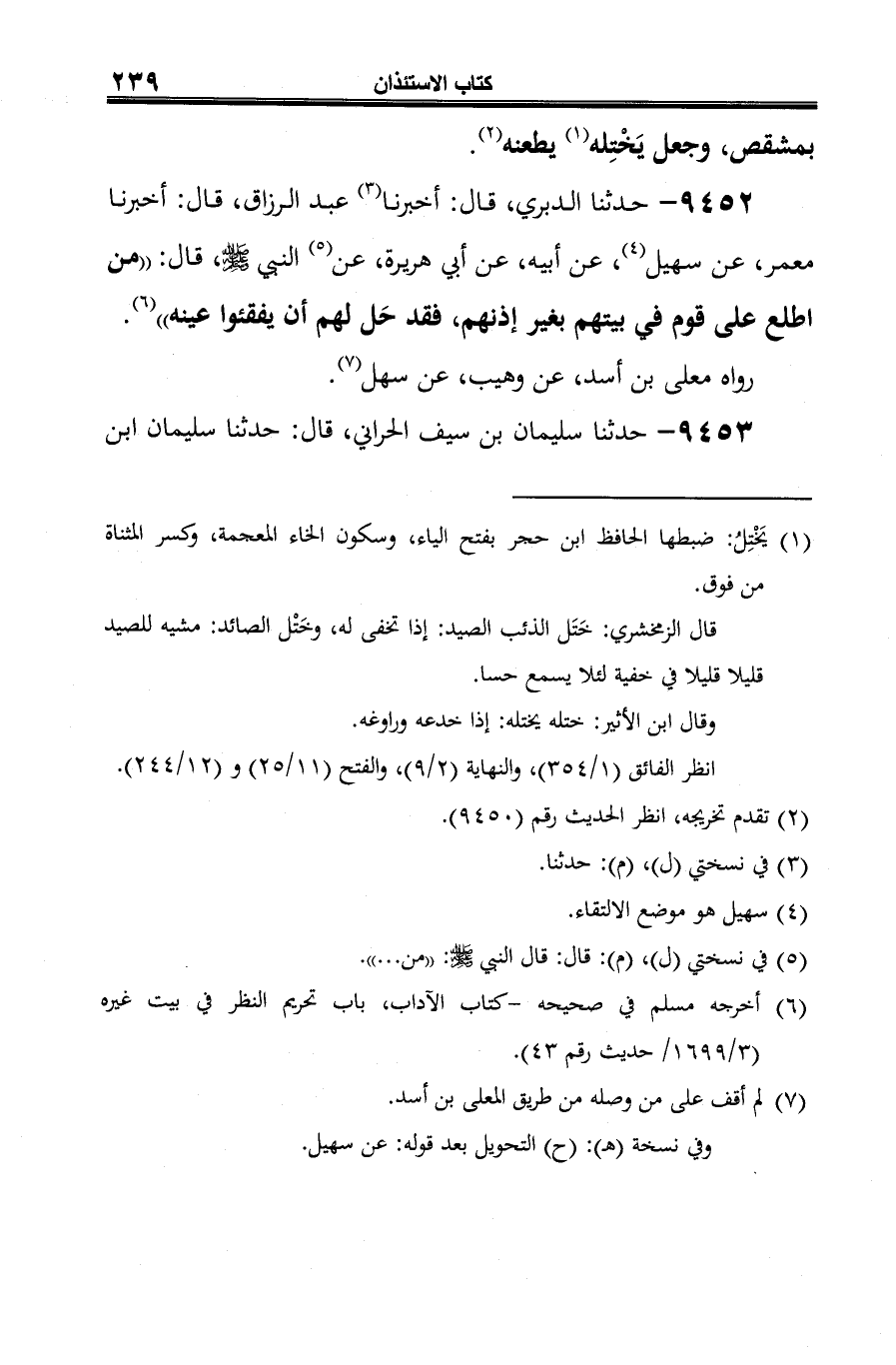 9452 - حدّثنا الدبري، قال: أخبرنا (¬1) عبد الرزّاق، قال: أخبرنا معمر، عن سهيل (¬2)، عن أبيه، عن أبي هريرة، عن (¬3) النبي -صلى الله عليه وسلم-، قال: "من اطلع على قوم في بيتهم بغير إذنهم، فقد حَل لهم أن يفقئوا عينه" (¬4).