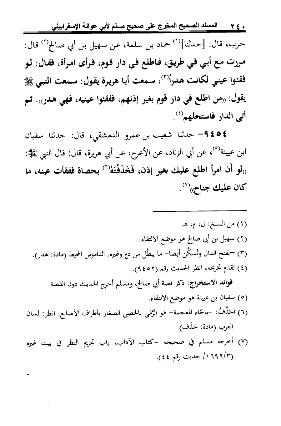9454 - حدّثنا شعيب بن عمرو الدمشقي، قال: حدّثنا سفيان ابن عيينة (¬1)، عن أبي الزِّناد، عن الأعرج، عن أبي هريرة، قال: قال النبي -صلى الله عليه وسلم-: "لو أَن امرأ اطلع عليك بغير إذن، فَخَذَفْتَهُ (¬2) بحصاة ففقأت عينه، ما كان عليك جناح" (¬3).