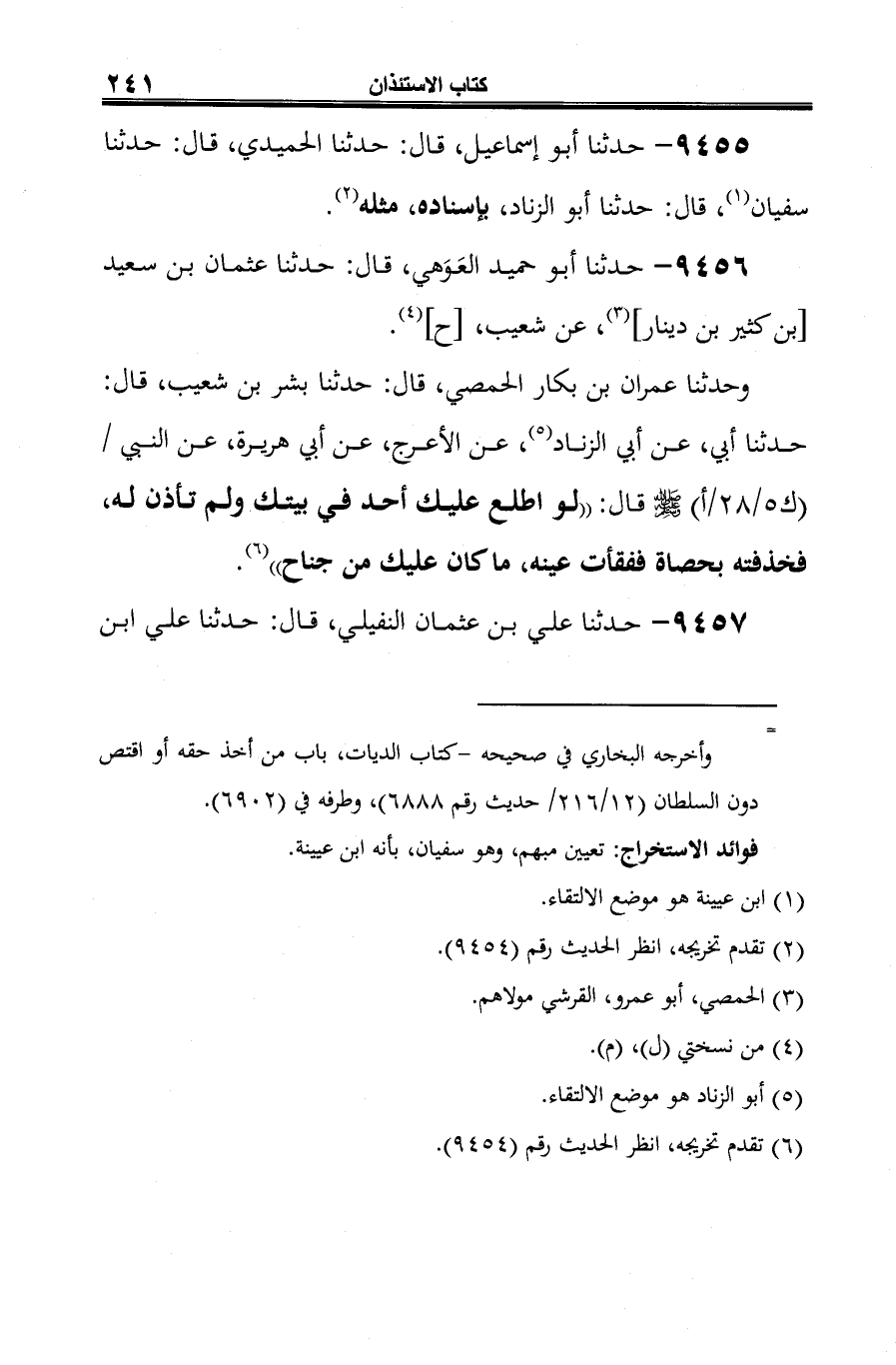 وحدثنا عمران بن بكار الحمصي، قال: حدّثنا بشر بن شعيب، قال: حدّثنا أبي، عن أبي الزِّناد (¬3)، عن الأعرج، عن أبي هريرة، عن النبي -صلى الله عليه وسلم- قال: "لو اطلع عليك أحد في بيتك ولم تأذن له، فخذفته بحصاة ففقأت عينه، ما كان عليك من جناح" (¬4).