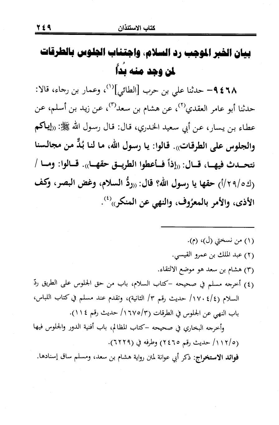 (¬4) أخرجه مسلم في صحيحه -كتاب السّلام، باب من حق الجلوس على الطريق ردّ السّلام (4/ 1704/ حديث رقم 3 / الثّانية)، وتقدم عند مسلم في كتاب اللباس، باب النّهي عن الجلوس في الطرقات (3/ 1675/ حديث رقم 114).