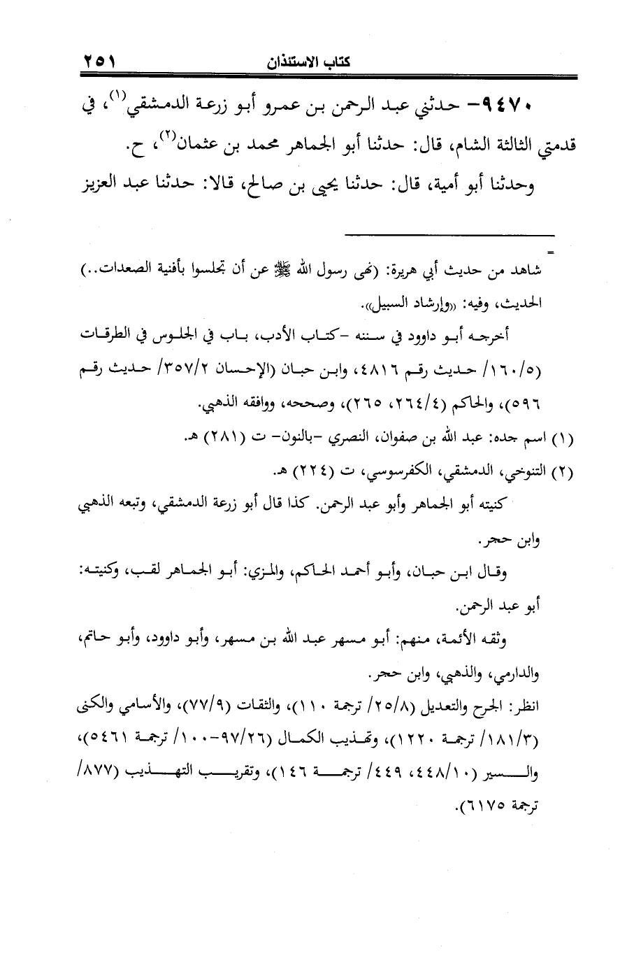 9470 - حدثني عبد الرّحمن بن عمرو أبو زرعة الدمشقي (¬1)، في قدمتي الثّالثة الشّام، قال: حدّثنا أبو الجماهر محمّد بن عثمان (¬2)، ح.