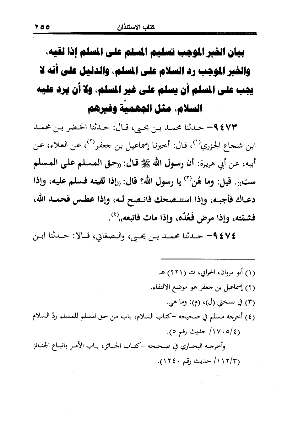 بيان الخبر الموجب تسليم المسلم على المسلم إذا لقيه، والخبر الموجب رد السلام على المسلم، والدليل على أنه لا يجب على المسلم أن يسلم على غير المسلم، ولا أن يردّ عليه السلام، مثل الجهميّة وغيرهم