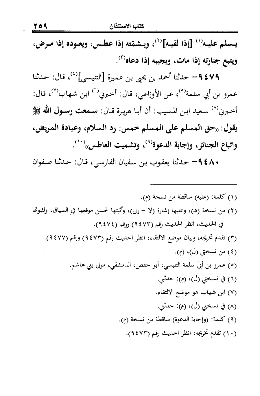 9479 - حدّثنا أحمد بن يحيى بن عميرة [التنيسي] (¬1)، قال: حدّثنا عمرو بن أبي سلمة (¬2)، عن الأوزاعي، قال: أخبرني (¬3) ابن شهاب (¬4)، قال: أخبرني (¬5) سعيد ابن المسيَّب: أن أبا هريرة قال: سمعت رسول الله -صلى الله عليه وسلم- يقول: "حق المسلم على المسلم خمس: رد السّلام، وعيادة المريض، واتباع الجنائز، وإجابة الدّعوة (¬6)، وتشميت العاطس" (¬7).