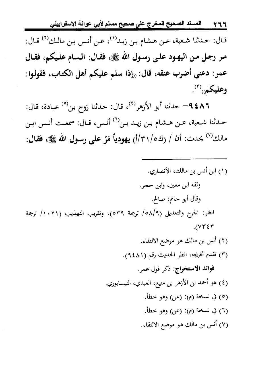 9486 - حدثنا أبو الأزهر (¬1)، قال: حدثنا رَوح بن (¬2) عبادة، قال: حدثنا شعبة، عن هشام بن زيد بن (¬3) أنس، قال: سمعت أنس ابن مالك (¬4) يحدث: أن يهوديًّا مَرّ على رسول الله -صلى الله عليه وسلم-، فقال: