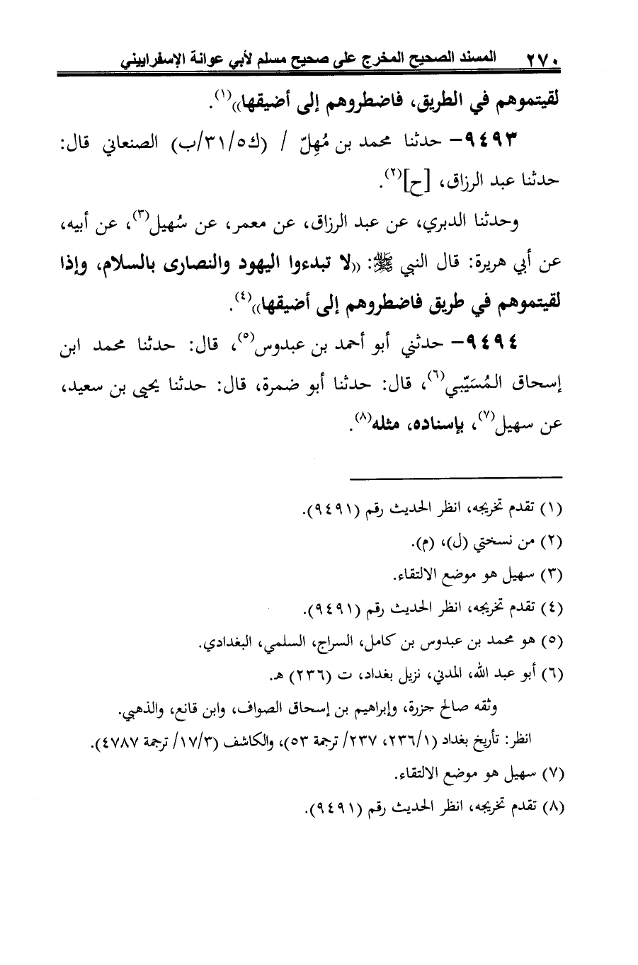 وحدثنا الدبري، عن عبد الرزاق، عن معمر، عن سُهيل (¬2)، عن أبيه، عن أبي هريرة: قال النبي صلى الله عليه وسلم: "لا تبدءوا اليهود والنصارى بالسلام، وإذا لقيتموهم في طريق فاضطروهم إلى أضيقها" (¬3).
