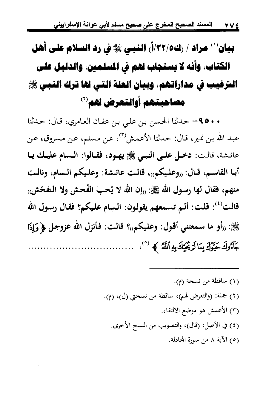 9500 - حدثنا الحسن بن علي بن عفان العامري، قال: حدثنا عبد الله بن نمير، قال: حدثنا الأعمش (¬1)، عن مسلم، عن مسروق، عن عائشة، قالت: دخل على النبي -صلى الله عليه وسلم- يهود، فقالوا: السام عليك يا أبا القاسم، قال: "وعليكم"، قالت عائشة: وعليكم السام، ونالت منهم، فقال لها رسول الله -صلى الله عليه وسلم-: "إن الله لا يُحب الفُحش ولا التفحّش" قالت (¬2): قلت: ألم تسمعهم يقولون: السام عليكم؟ فقال رسول الله -صلى الله عليه وسلم-: "أو ما سمعتني أقول: وعليكم"؟ قالت: فأنزل الله عز وجل {وَإِذَا جَاءُوكَ حَيَّوْكَ بِمَا لَمْ يُحَيِّكَ بِهِ اللَّهُ} (¬3)،