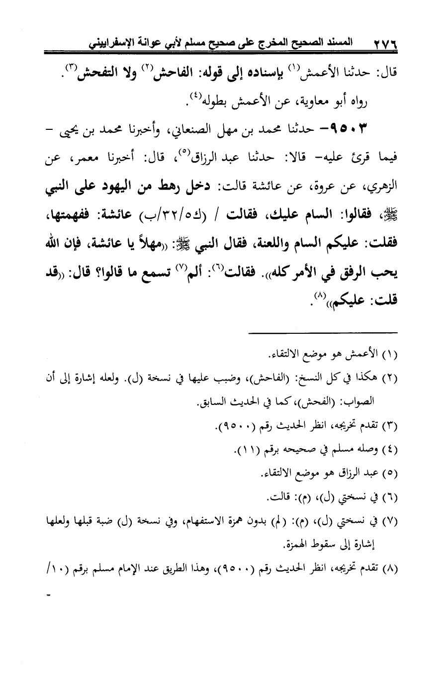 -[278]- = - بيان أنه روي عن عبد الرزاق إثبات حرف الواو في: "وعليكم"، فإن مسلمًا نبه على أنه ليس في رواية عبد الرزاق إثبات الواو.