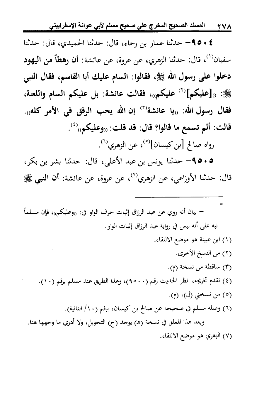 9504 - حدثنا عمار بن رجاء، قال: حدثنا الحميدي، قال: حدثنا سفيان (¬1)، قال: حدثنا الزهري، عن عروة، عن عائشة: أن رهطًا من اليهود دخلوا على رسول الله -صلى الله عليه وسلم-، فقالوا: السام عليك أبا القاسم، فقال النبي -صلى الله عليه وسلم-: " [عليكم] (¬2) عليكم"، فقالت عائشة: بل عليكم السام واللعنة، فقال رسول الله: "يا عائشة (¬3) إن الله يحب الرفق في الأمر كله". قالت: ألم تسمع ما قالوا؟ قال: قد قلت: "وعليكم" (¬4).