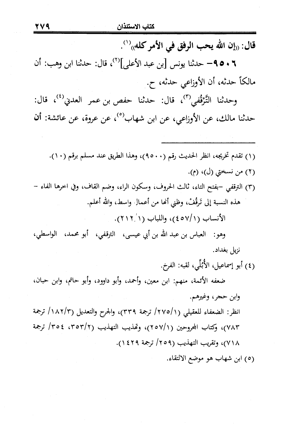 وحدثنا التَّرْقُفي (¬2)، قال: حدثنا حفص بن عمر العدني (¬3)، قال: حدثنا مالك، عن الأوزاعي، عن ابن شهاب (¬4)، عن عروة، عن عائشة: أن