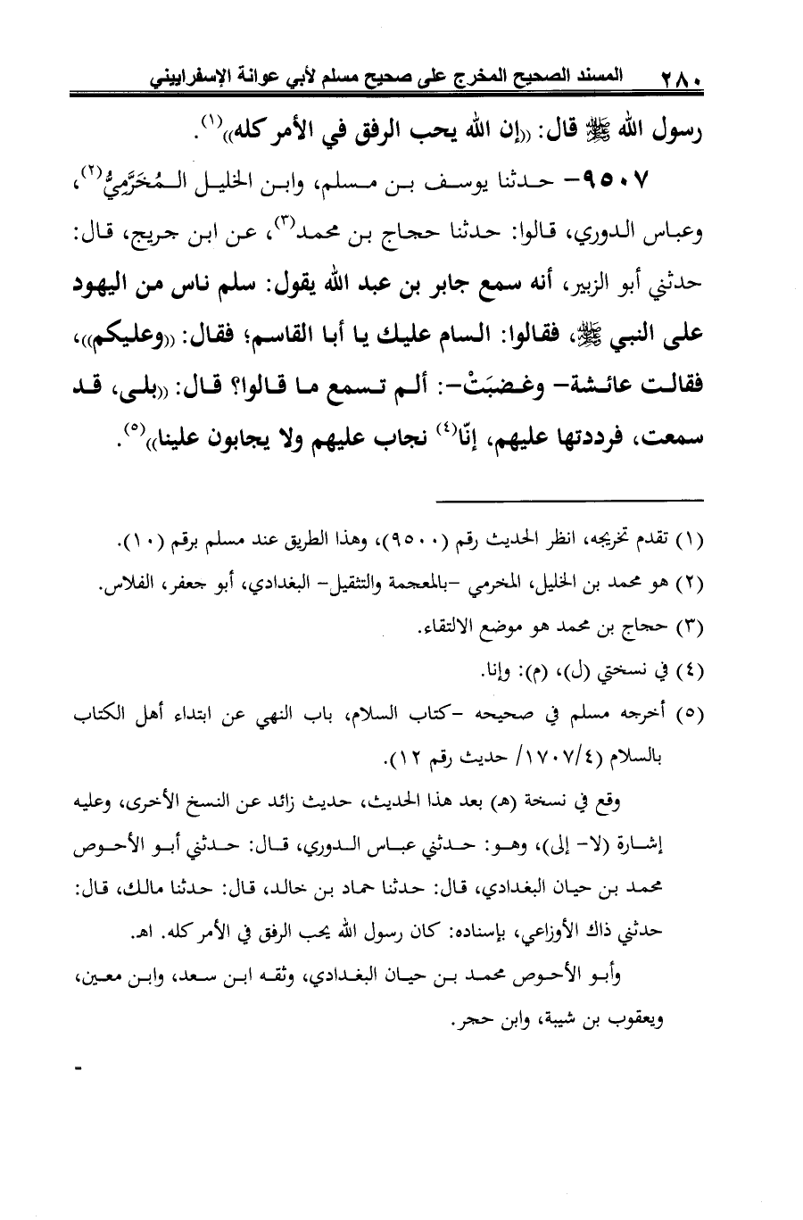 وقع في نسخة (هـ) بعد هذا الحديث، حديث زائد عن النسخ الأخرى، وعليه إشارة (لا- إلى)، وهو: حدثني عباس الدوري، قال: حدثني أبو الأحوص محمد بن حيان البغدادي، قال: حدثنا حماد بن خالد، قال: حدثنا مالك، قال: حدثني ذاك الأوزاعي، بإسناده: كان رسول الله يحب الرفق في الأمر كله. اهـ.