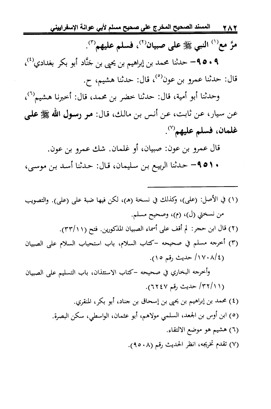 9509 - حدثنا محمد بن إبراهيم بن يحيى بن جَنَّاد أبو بكر بغدادي (¬1)، قال: حدثنا عمرو بن عون (¬2)، قال: حدثنا هشيم، ح.