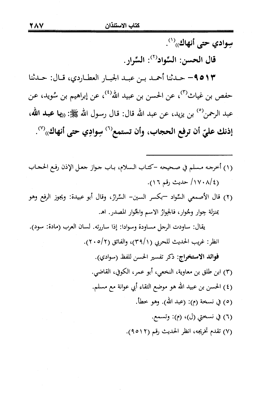 9513 - حدثنا أحمد بن عبد الجبار العطاردي، قال: حدثنا حفص بن غياث (¬1)، عن الحسن بن عبيد الله (¬2)، عن إبراهيم بن سُويد، عن عبد الرحمن (¬3) بن يزيد، عن عبد الله قال: قال رسول الله -صلى الله عليه وسلم-: "يا عبد الله، إذنك عليّ أن ترفع الحجاب، وأن تستمع (¬4) سِوادِي حتى أنهاك" (¬5).