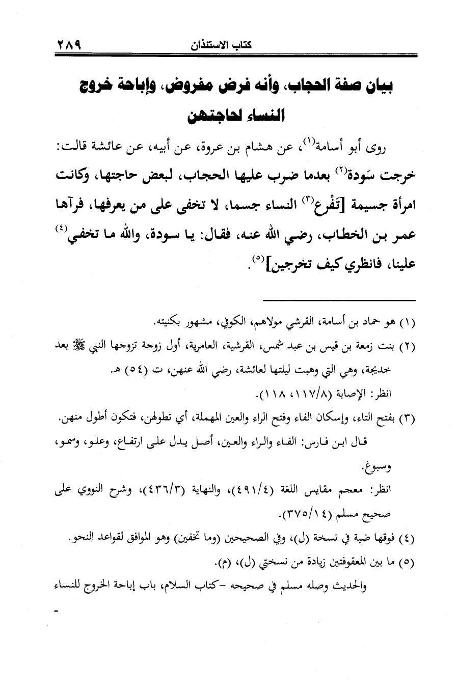 روى أبو أسامة (¬1)، عن هشام بن عروة، عن أبيه، عن عائشة قالت: خرجت سَودة (¬2) بعدما ضرب عليها الحجاب، لبعض حاجتها، وكانت امرأة جسيمة [تَفْرع (¬3) النساء جسما، لا تخفى على من يعرفها، فرآها عمر بن الخطاب، رضي الله عنه، فقال: يا سودة، والله ما تخفي (¬4) علينا، فانظري كيف تخرجين] (¬5).