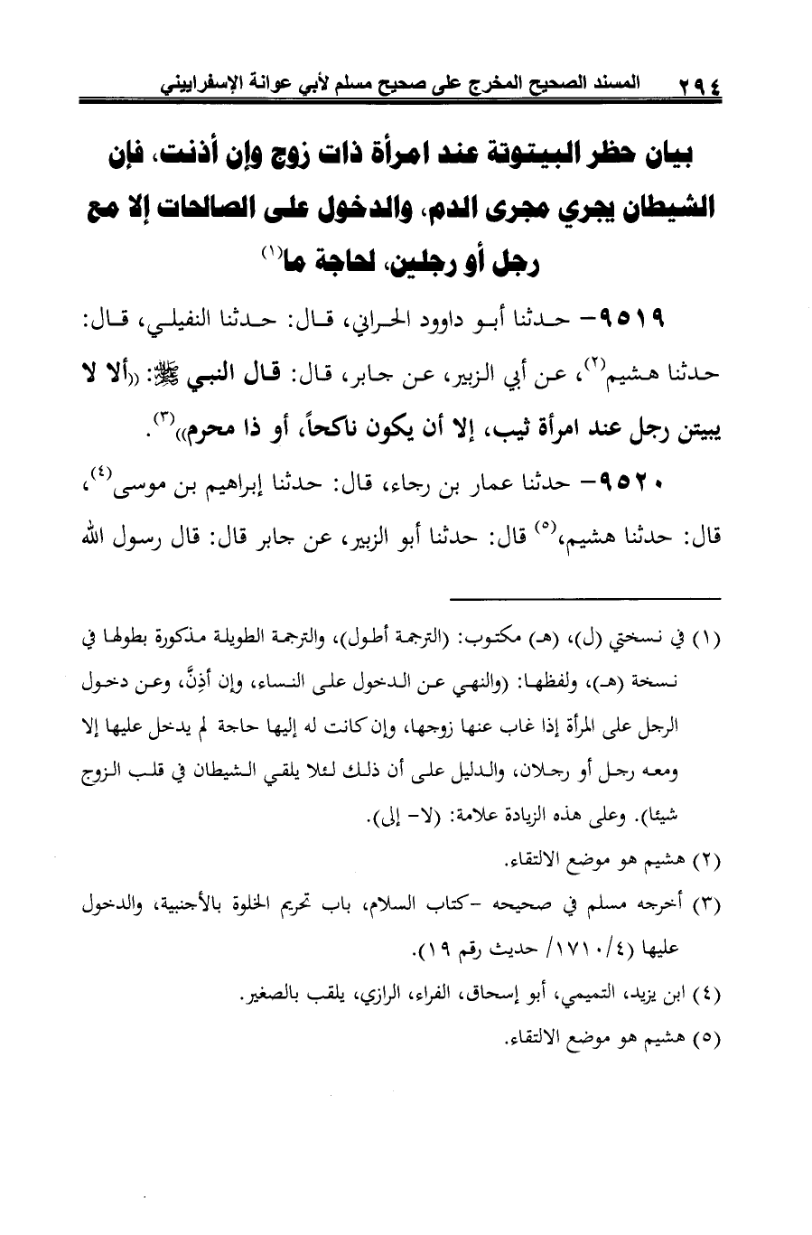 (¬1) في نسختي (ل)، (هـ) مكتوب: (الترجمة أطول)، والترجمة الطويلة مذكورة بطولها في نسخة (هـ)، ولفظها: (والنهي عن الدخول على النساء، وإن أذِنَّ، وعن دخول الرجل على المرأة إذا غاب عنها زوجها، وإن كانت له إليها حاجة لم يدخل عليها إلا ومعه رجل أو رجلان، والدليل على أن ذلك لئلا يلقي الشيطان في قلب الزوج شيئا). وعلى هذه الزيادة علامة: (لا- إلى).
