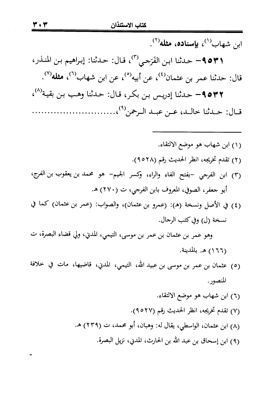 9531 - حدثنا ابن الفَرَجي (¬1)، قال: حدثنا: إبراهيم بن المنذر، قال: حدثنا عمر بن عثمان (¬2)، عن أبيه (¬3)، عن ابن شهاب (¬4)، مثله (¬5).