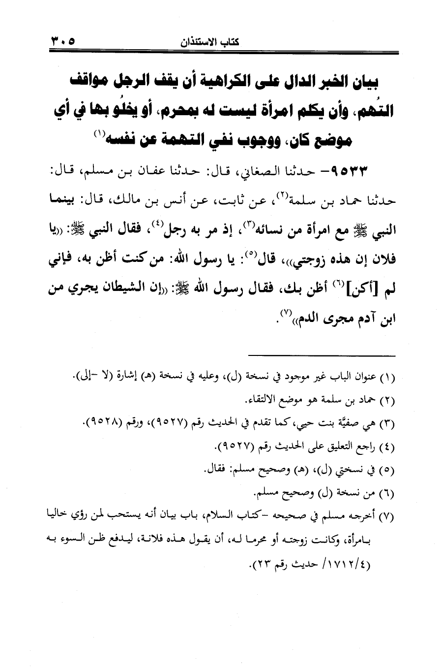 9533 - حدثنا الصغاني، قال: حدثنا عفان بن مسلم، قال: حدثنا حماد بن سلمة (¬1)، عن ثابت، عن أنس بن مالك، قال: بينما النبي -صلى الله عليه وسلم- مع امرأة من نسائه (¬2)، إذ مر به رجل (¬3)، فقال النبي -صلى الله عليه وسلم-: "يا فلان إن هذه زوجتي"، قال (¬4): يا رسول الله: من كنت أظن به، فإني لم [أكن] (¬5) أظن بك، فقال رسول الله -صلى الله عليه وسلم-: "إن الشيطان يجري من ابن آدم مجرى الدم" (¬6).