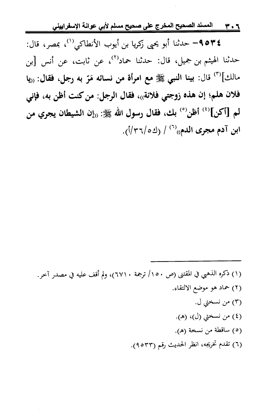 9534 - حدثنا أبو يحيى زكريا بن أيوب الأنطاكي (¬1)، بمصر، قال: حدثنا الهيثم بن جميل، قال: حدثنا حماد (¬2)، عن ثابت، عن أنس [بن مالك] (¬3) قال: بينا النبي -صلى الله عليه وسلم- مع امرأة من نسائه مَرّ به رجل، فقال: "يا فلان هلم؛ إن هذه زوجتى فلانة"، فقال الرجل: من كنت أظن به، فإني لم [أكن] (¬4) أظن (¬5) بك، فقال رسول الله -صلى الله عليه وسلم-: "إن الشيطان يجري من ابن آدم مجرى الدم" (¬6).