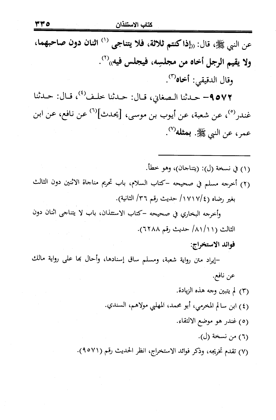 9572 - حدثنا الصغاني، قال: حدثنا خلف (¬1)، قال: حدثنا غندر (¬2)، عن شعبة، عن أيوب بن موسى، [يحدث] (¬3) عن نافع، عن ابن عمر، عن النبي -صلى الله عليه وسلم- بمثله (¬4).
