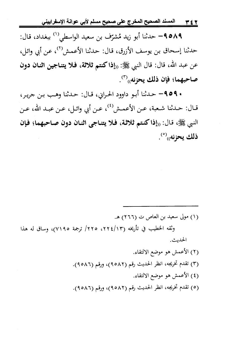 9589 - حدثنا أبو زيد مُشرّف بن سعيد الواسطي (¬1) ببغداد، قال: حدثنا إسحاق بن يوسف الأزرق، قال: حدثنا الأعمش (¬2)، عن أبي وائل، عن عبد الله، قال: قال النبي -صلى الله عليه وسلم-: "إذا كنتم ثلاثة، فلا يتناجين اثنان دون صاحبهما؛ فإن ذلك يحزنه" (¬3).